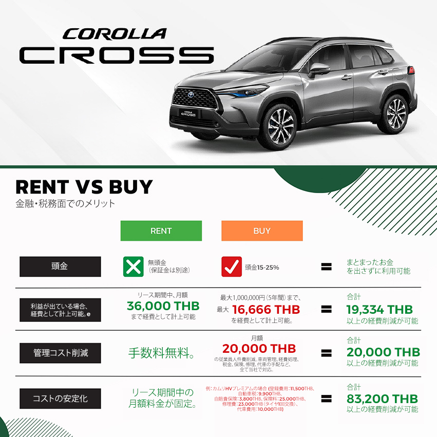 レンタカーは、月々の支払いが固定で、追加費用もほとんどかからないため、非常に経済的です。また、支払ったリース料は、法人税の経費として計上することができます。(ただし、1台あたり月額36,000バーツまで)